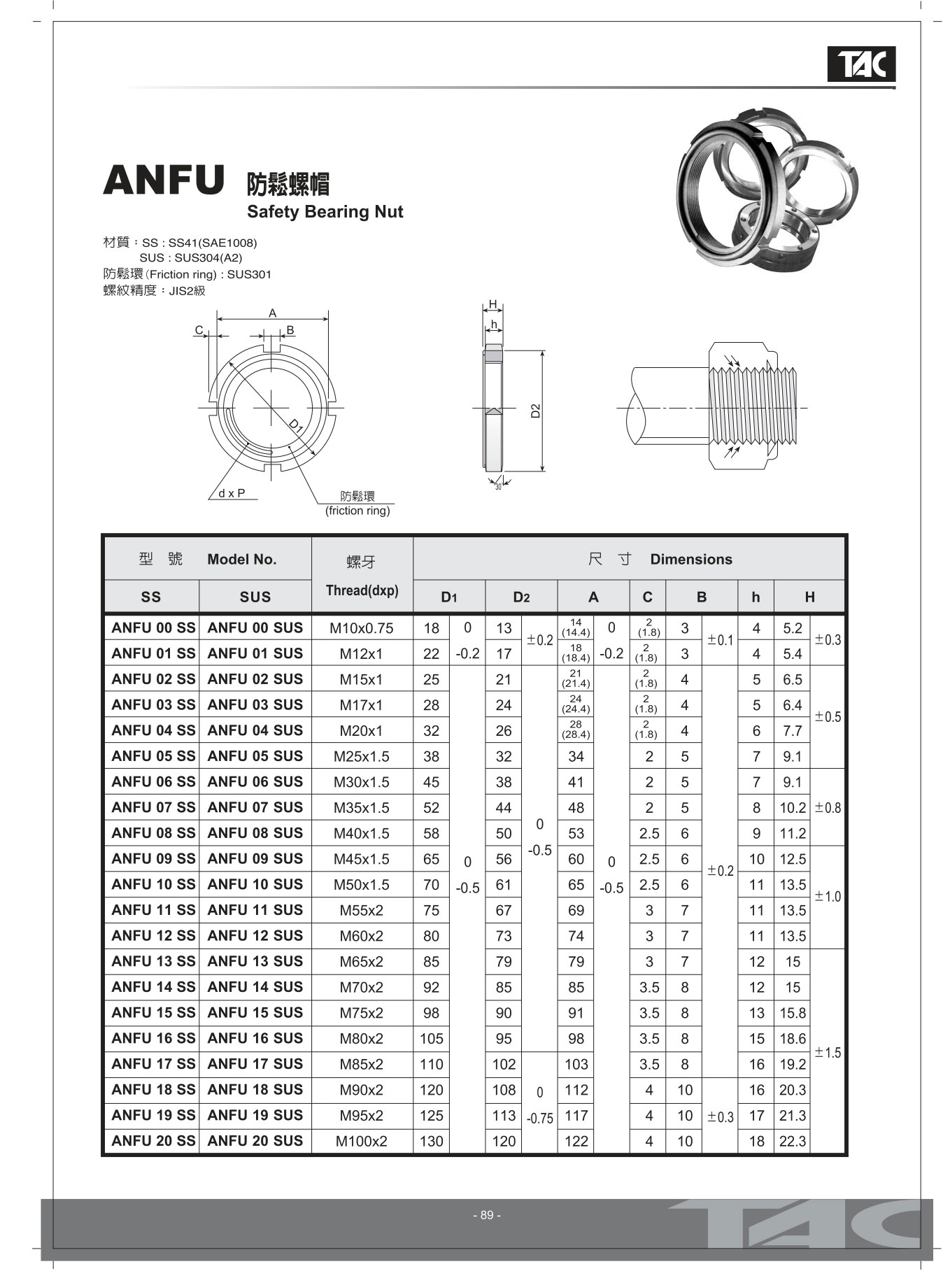 ANFU Safety Bearing Nut Safety Bearing Nut Material: SS:SS41(SAE1008) SUS:SUS304(A2)Friction ring:SUS301Thread accuracy: JIS2 level Inquiry Back to List Prev Next ANFU.pdf