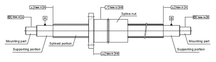 The accuracy of the Ball Spline is classiffed into three grades: normal grade (N), high accuracy grade (H) and precision grade (P), according to the runout of spline nut circumference in relation to the support of the spline shaft. shows measurement items.